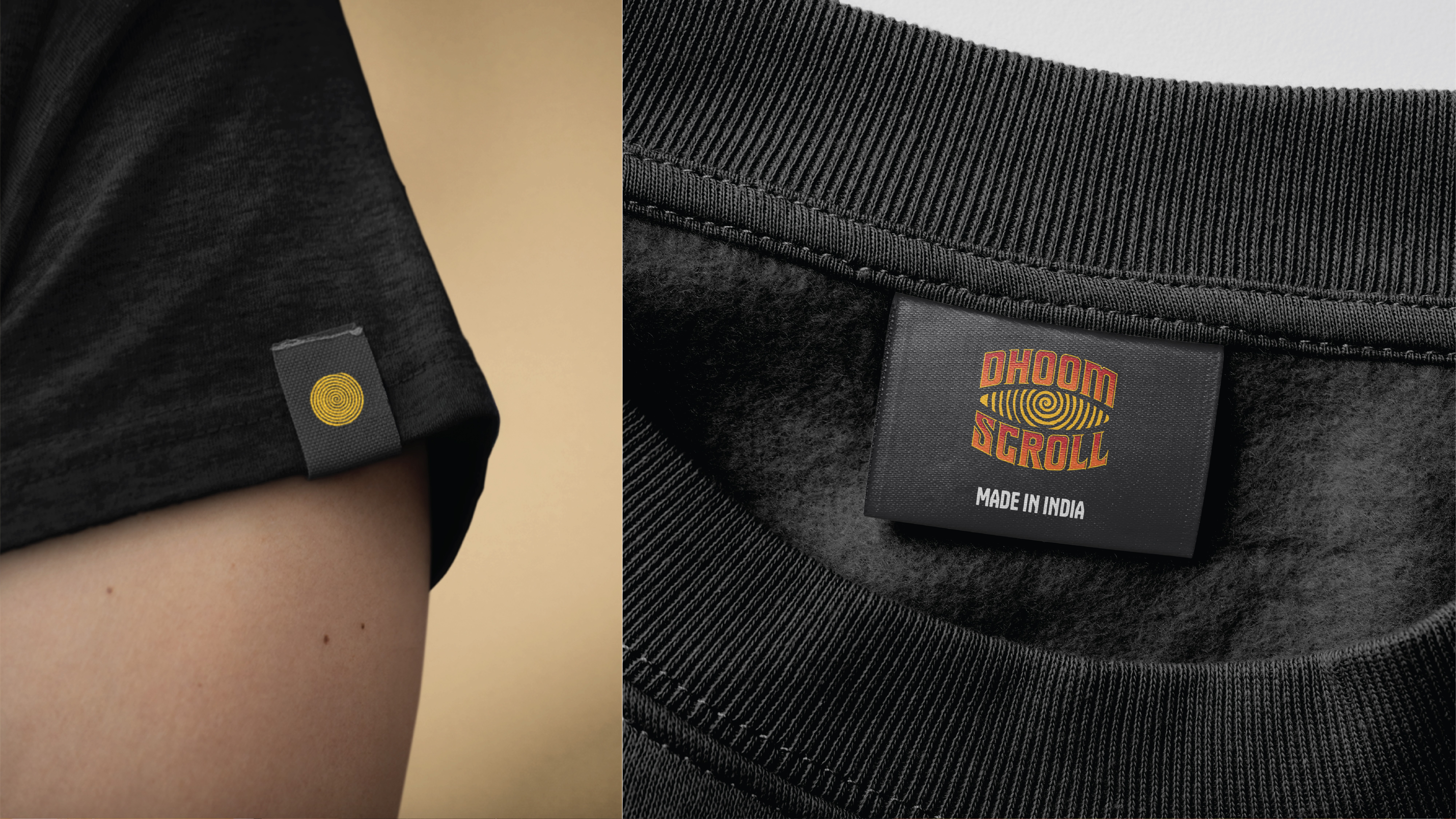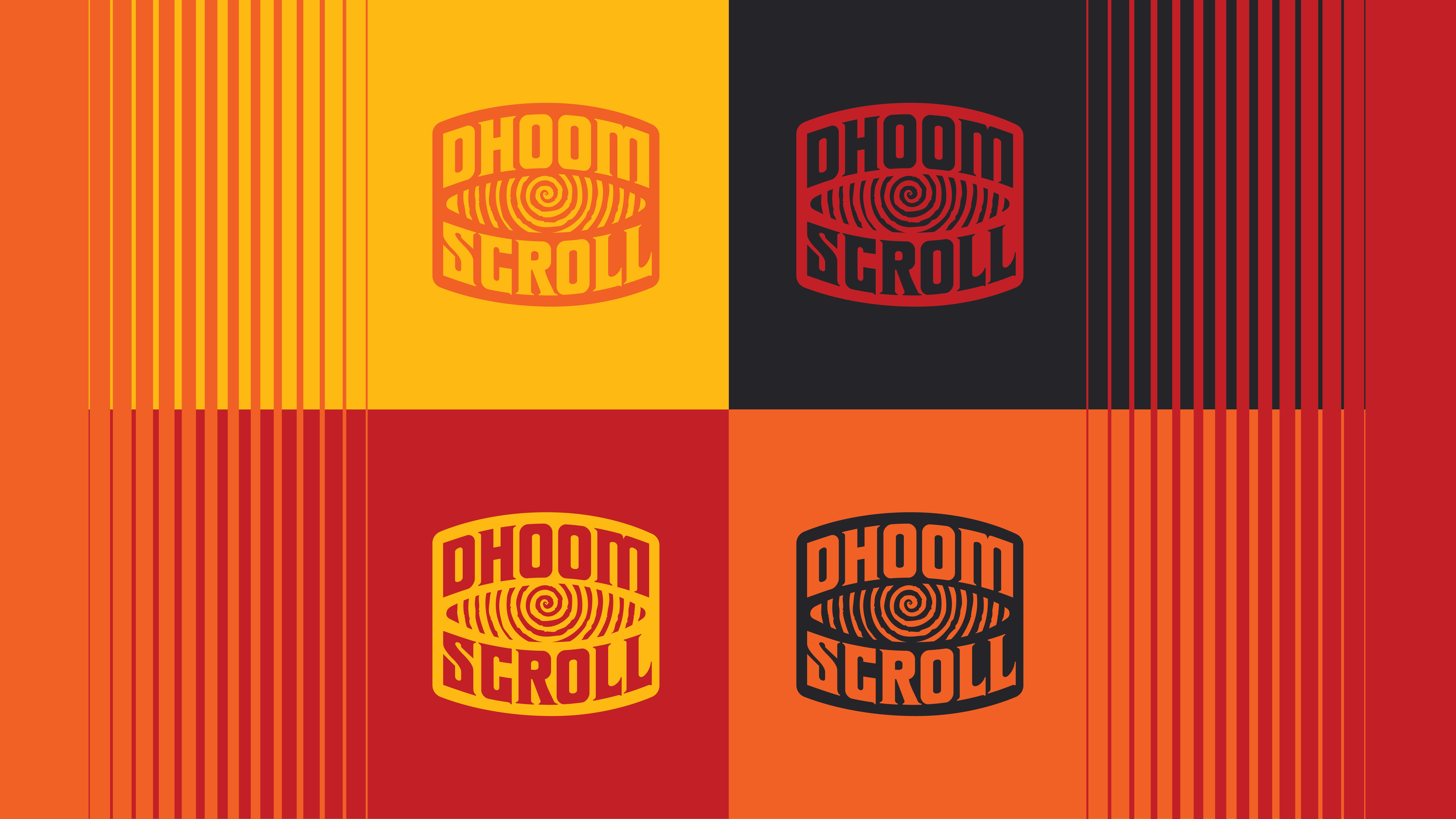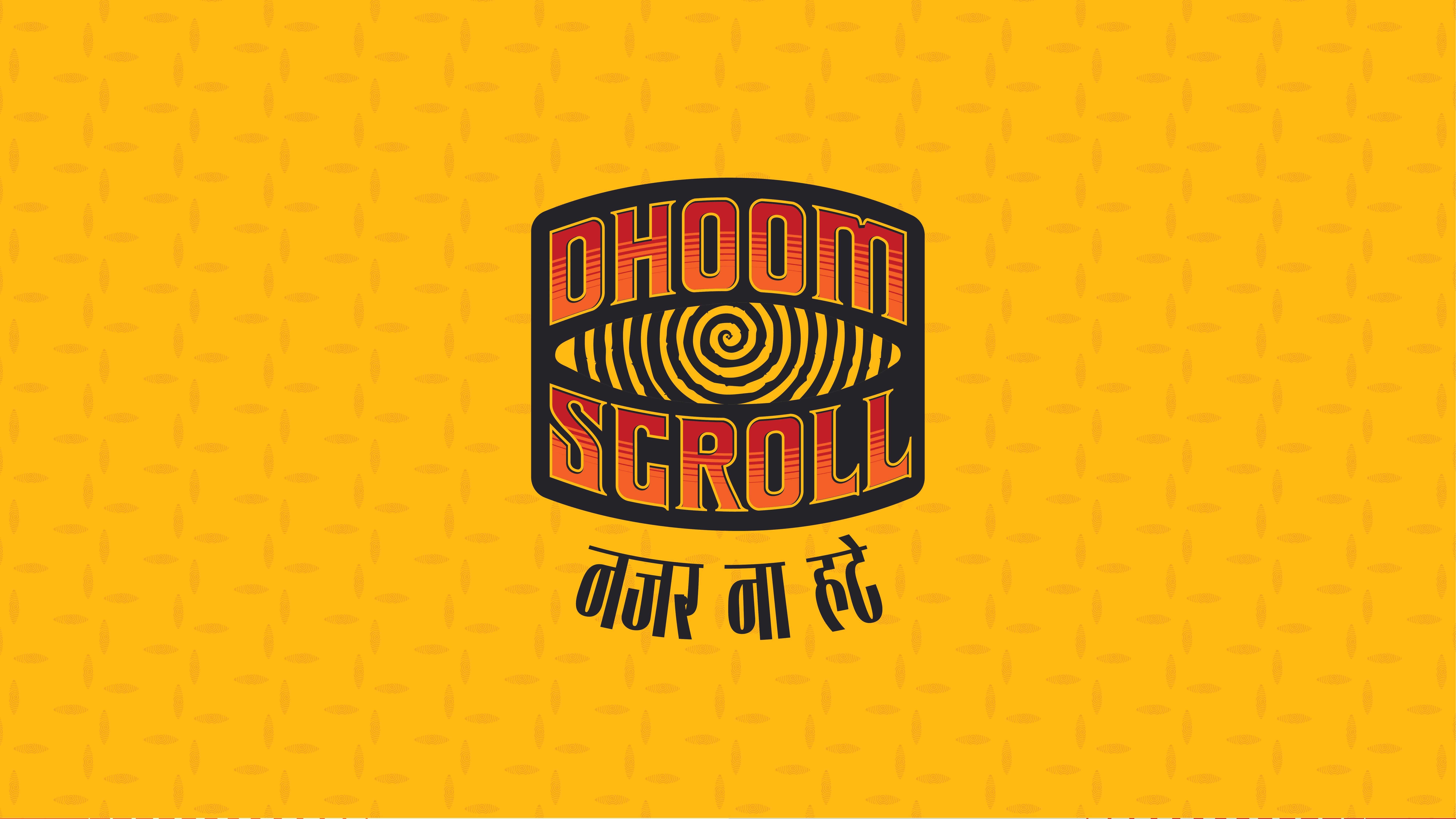 Dhoomscroll — wear your scrolling habit. A bold, filmy, overstimulated visual identity that turns our everyday doomscrolling culture into expressive, witty, wearable design. Not to change behaviour — just to celebrate the chaos we all recognise.