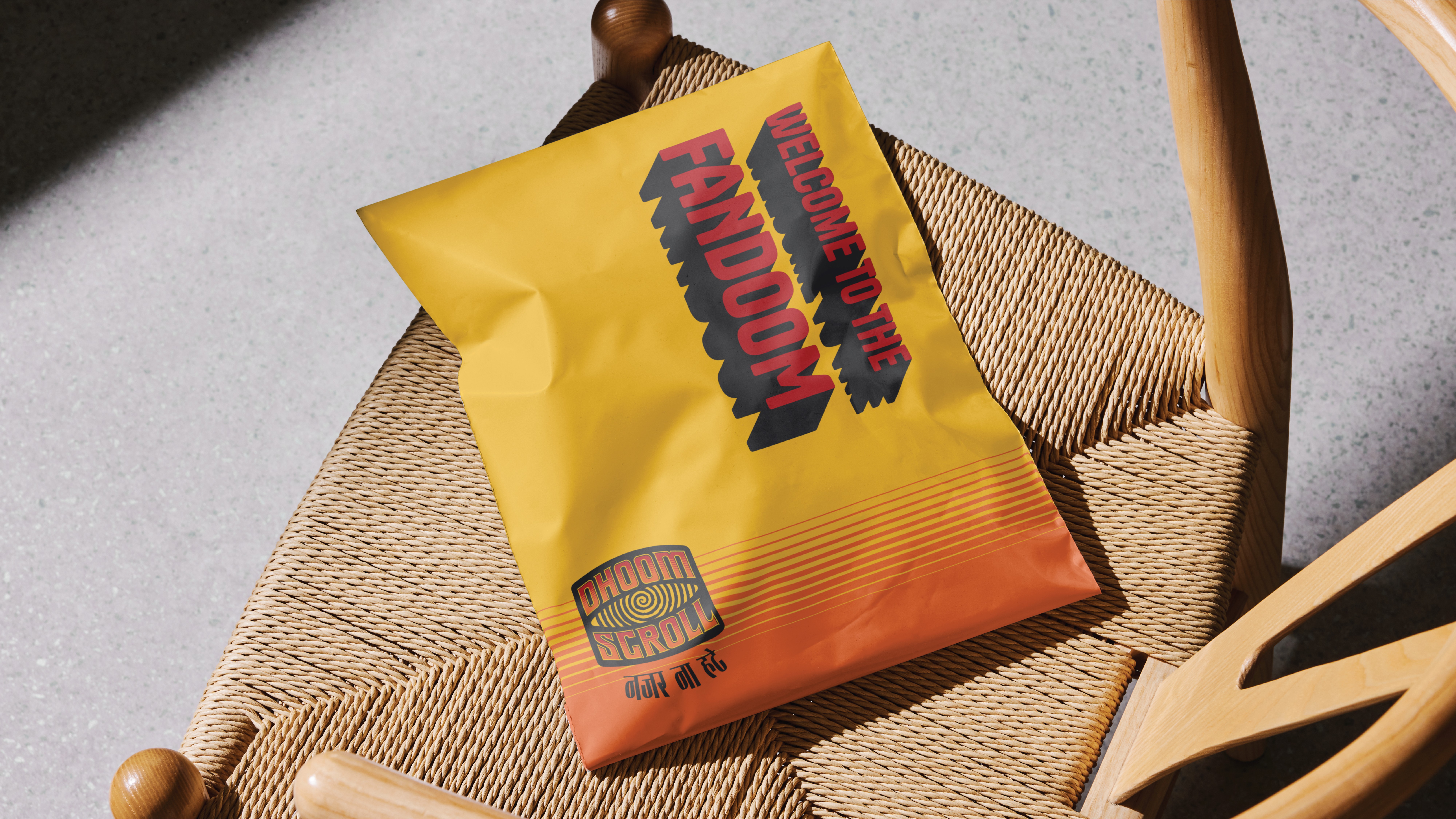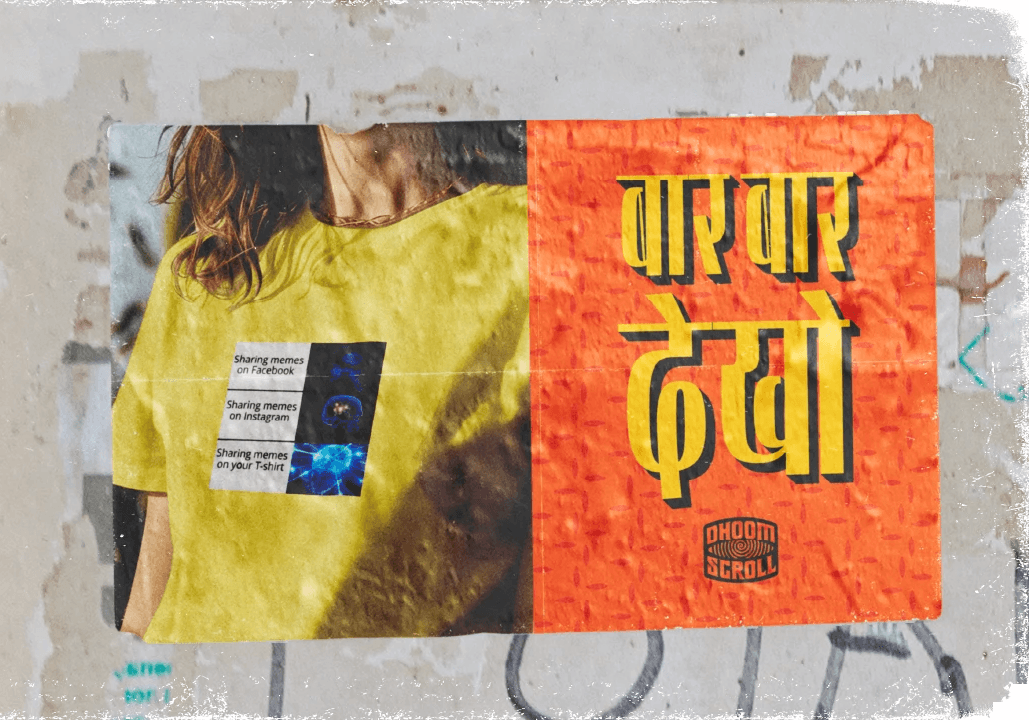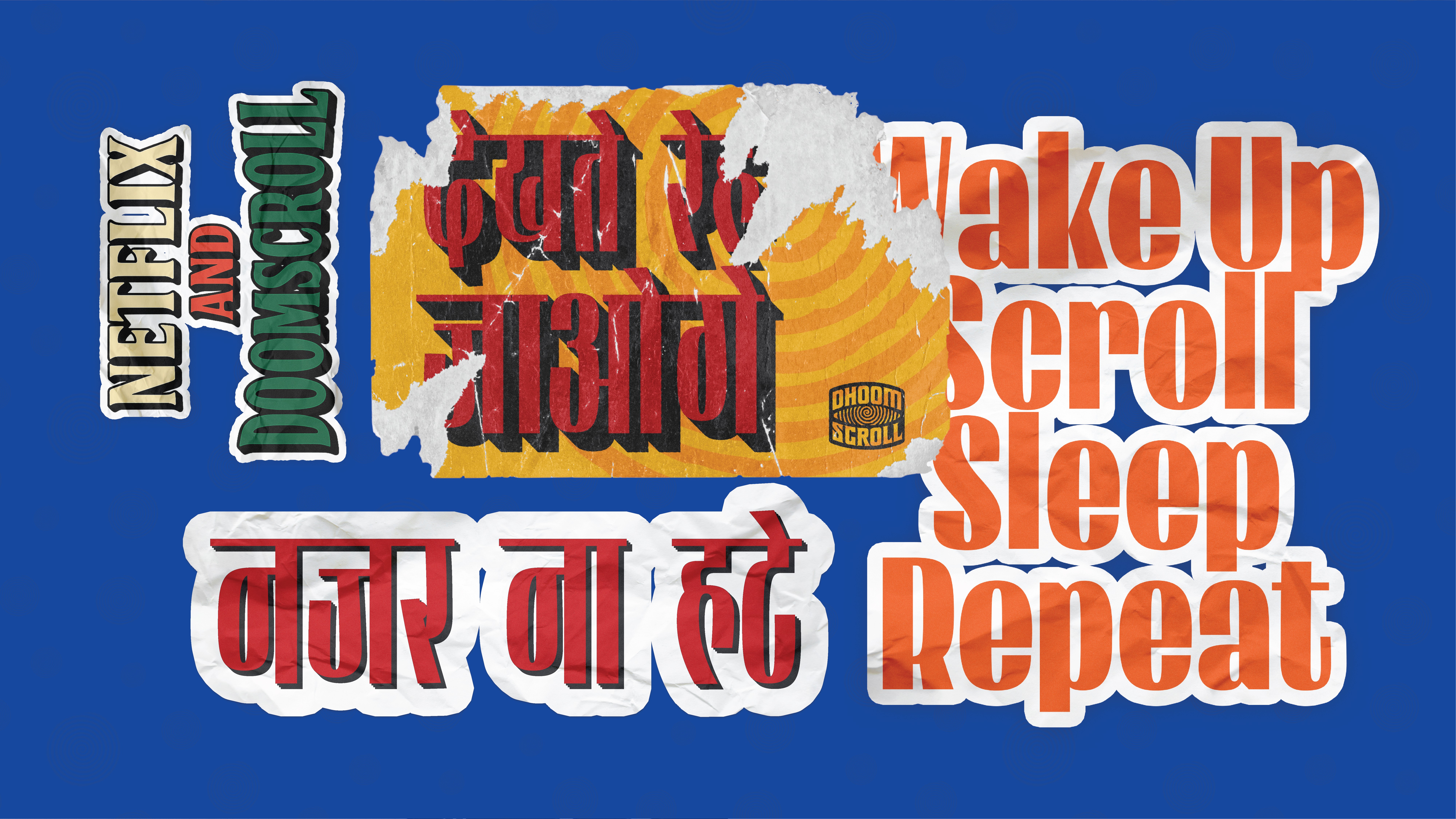 Dhoomscroll — wear your scrolling habit. A bold, filmy, overstimulated visual identity that turns our everyday doomscrolling culture into expressive, witty, wearable design. Not to change behaviour — just to celebrate the chaos we all recognise.