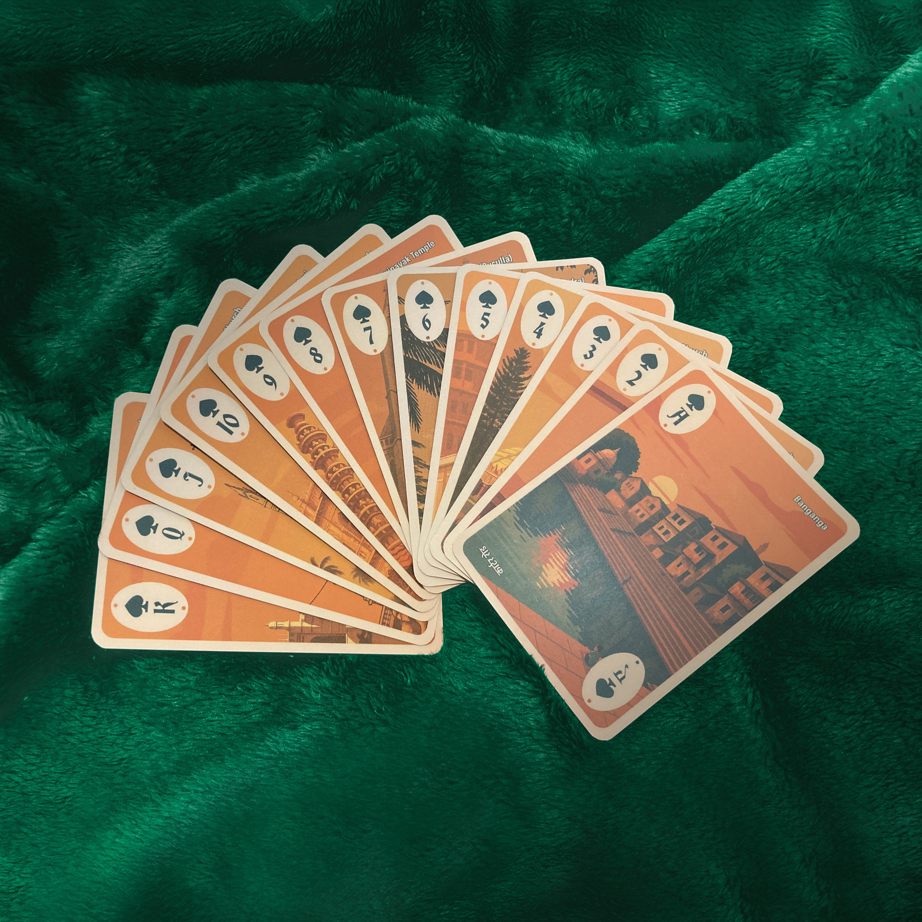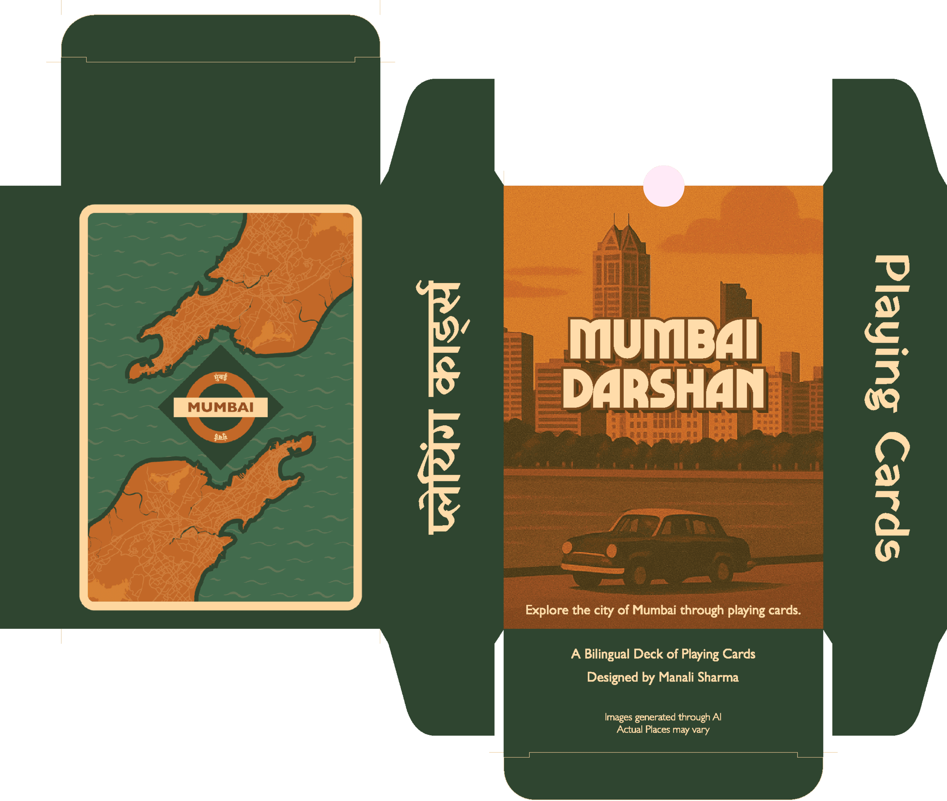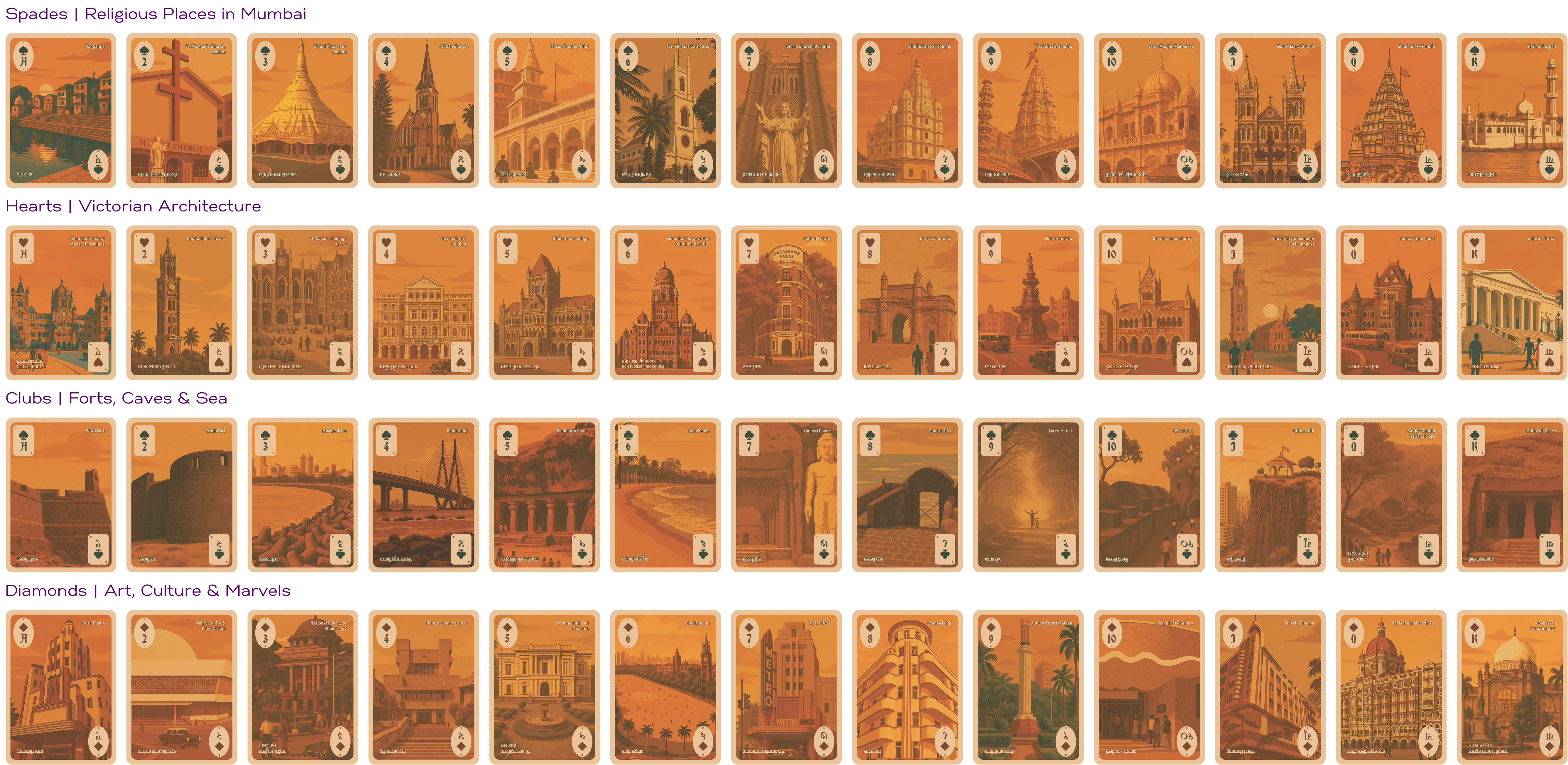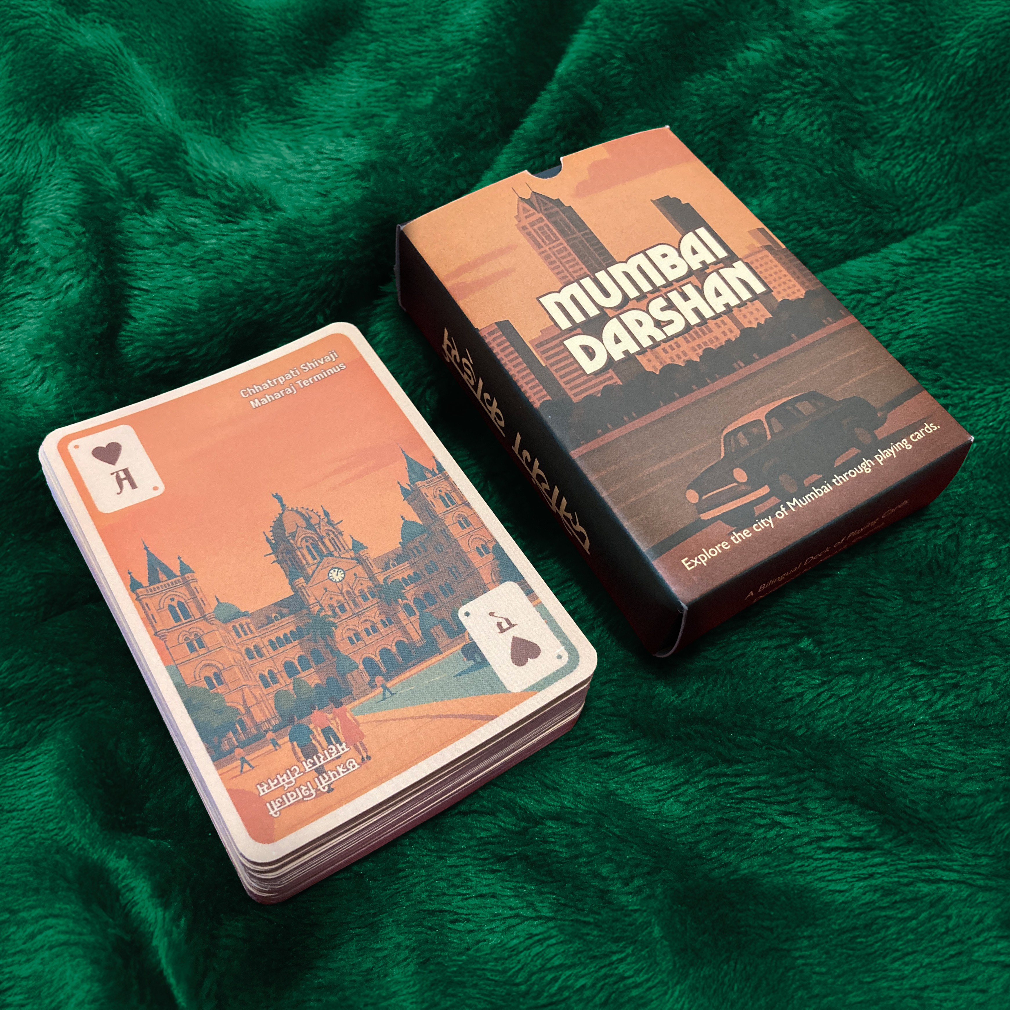 Mumbai Darshan is a bilingual deck of 52 illustrated playing cards that takes you on a nostalgic journey through the city. Each suit represents a different side of Mumbai, from colonial icons to modern marvels. The visuals share a warm, nostalgic tone with a consistent sky colour. Numbers are styled like vintage door plates, and bilingual Marathi–English text reflects the city’s character. The mirrored back design of the Mumbai peninsula allows the deck to be used in either direction.